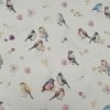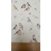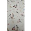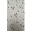 Bavlněný úplet s jarním vzorem ptáčků a květů na světle krémovém podkladu. Digitální tisk.