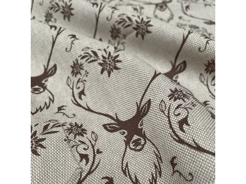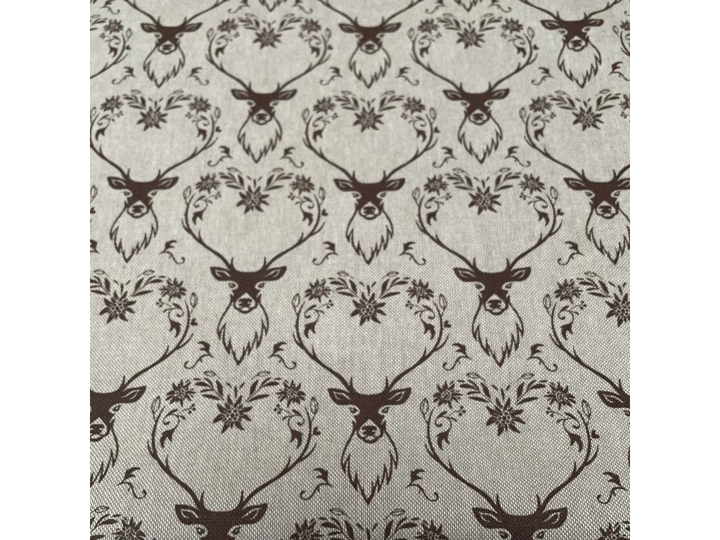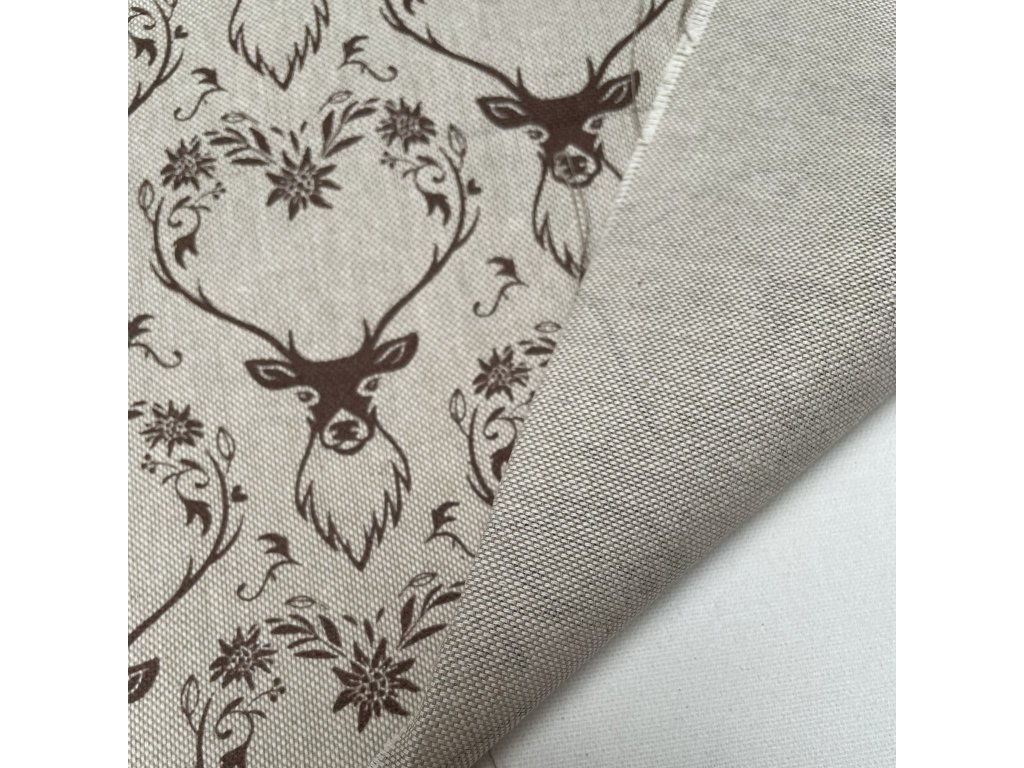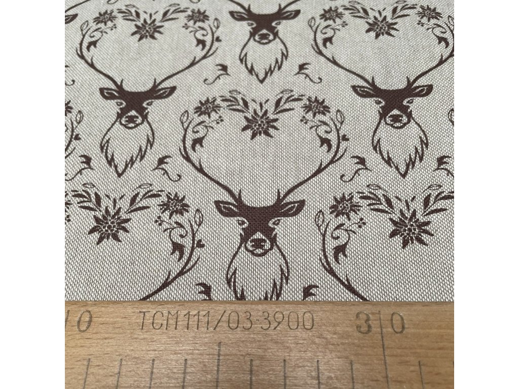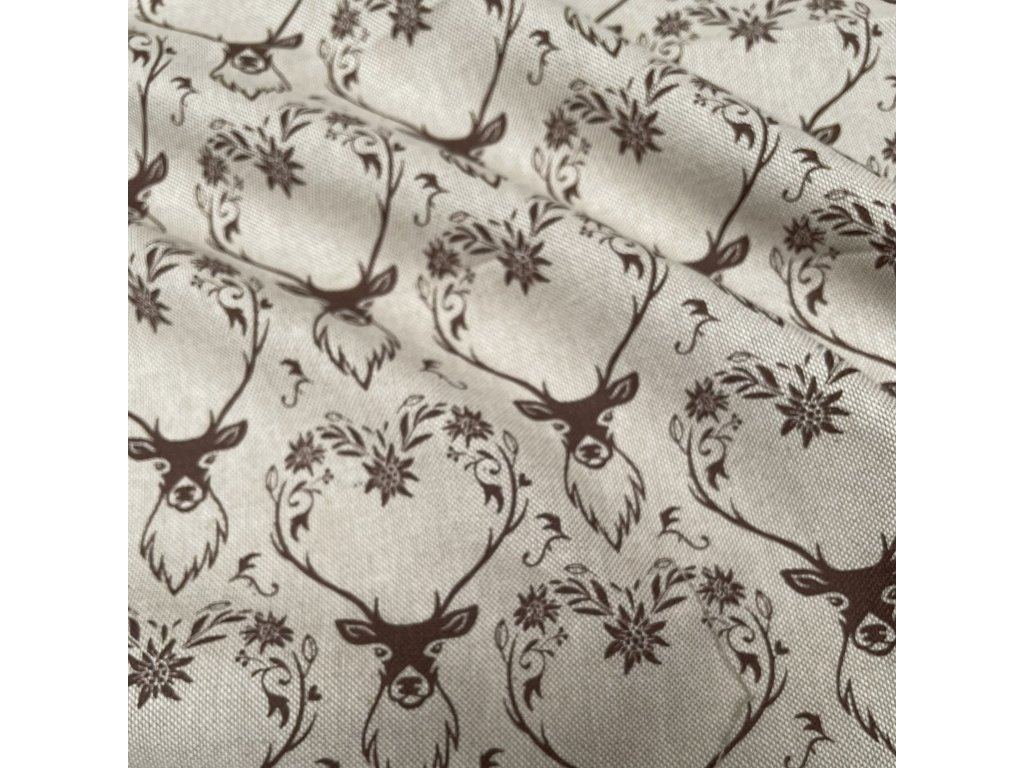 Dekorační látka s jeleními hlavami s dekorativním florálním parožím na režném podkladu (tisk).