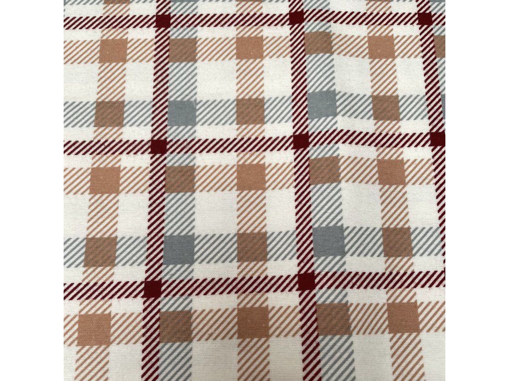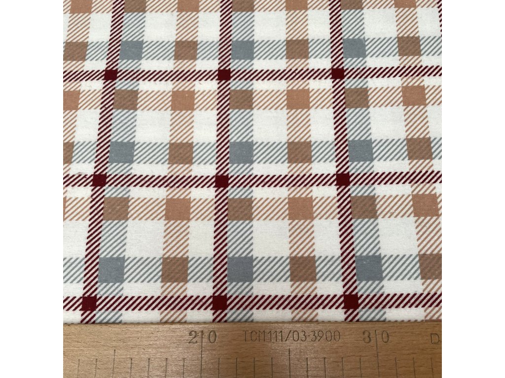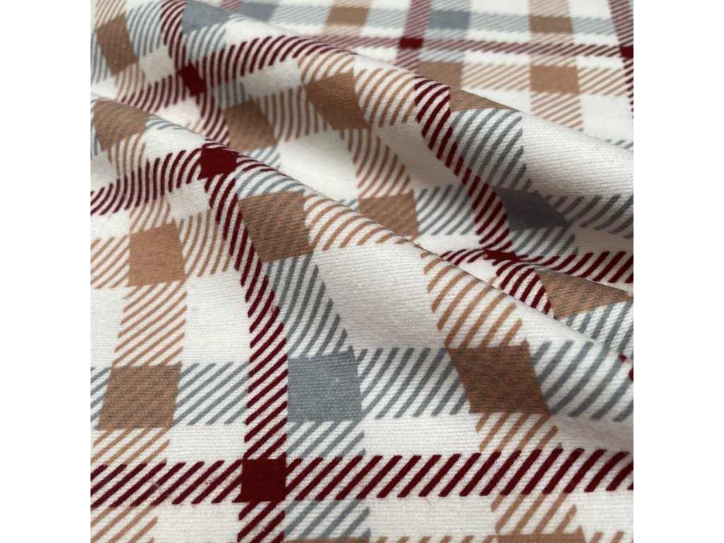 Bavlněný flanel s lososovo-bledě modrou kostkou. Ideální k oděvním účelům, například na košile či pyžama.