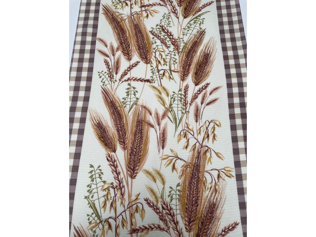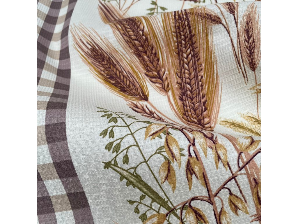 Bavlněná vaflovina se vzorem obilných klasů v šíři 50cm. Látka je vhotná na šití utěrek, běhounů či prostírání. Po vyprání nabyde na objemu, získá na prostorovosti.