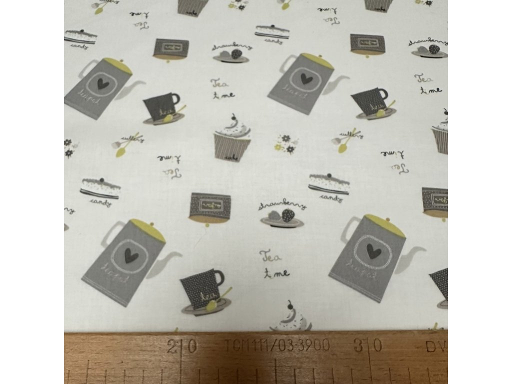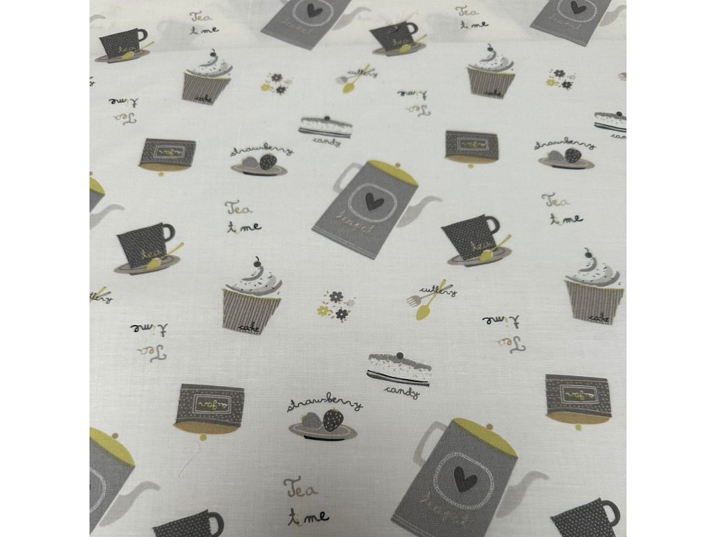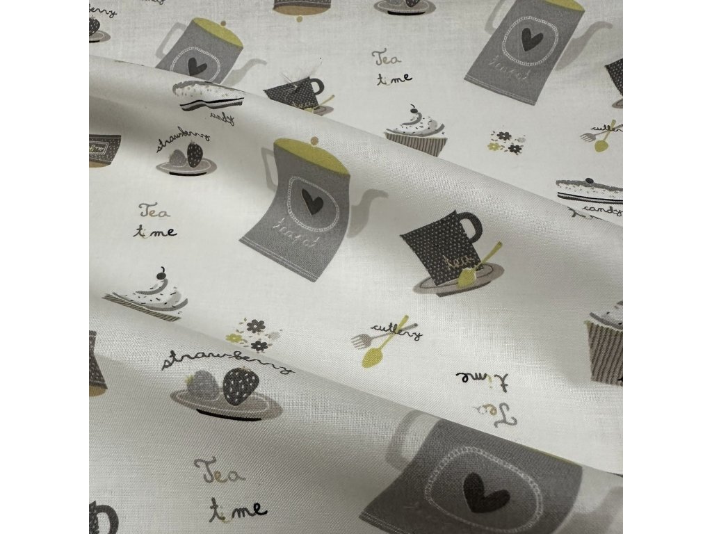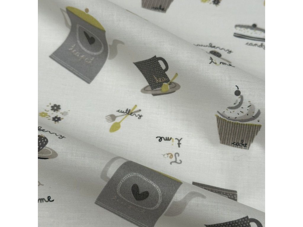 Bavlněné plátno se vzorem čajových konviček a dortíků v šedo-zelených barvách na krémovém podkladu.
